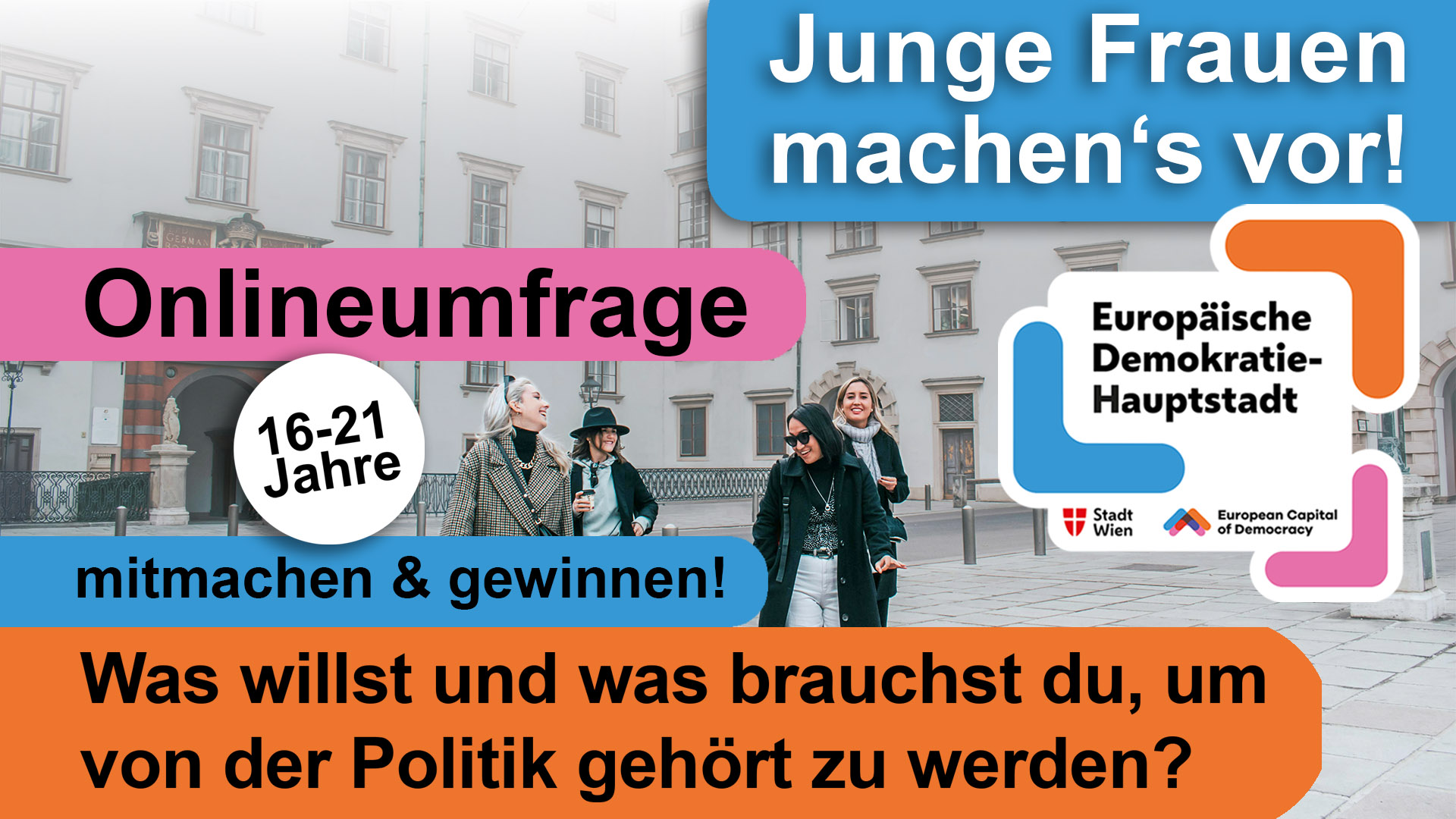 Was beschäftigt junge Frauen in Wien? Welche Ideen und Anregungen haben sie für ihre Stadt und ihren Bezirk? Im Rahmen eines Projekts zur Europäischen Demokratiehauptstadt Wien befragen wir dazu junge Wienerinnen zwischen 16 und 21 Jahren. Auch deine Meinung zählt!