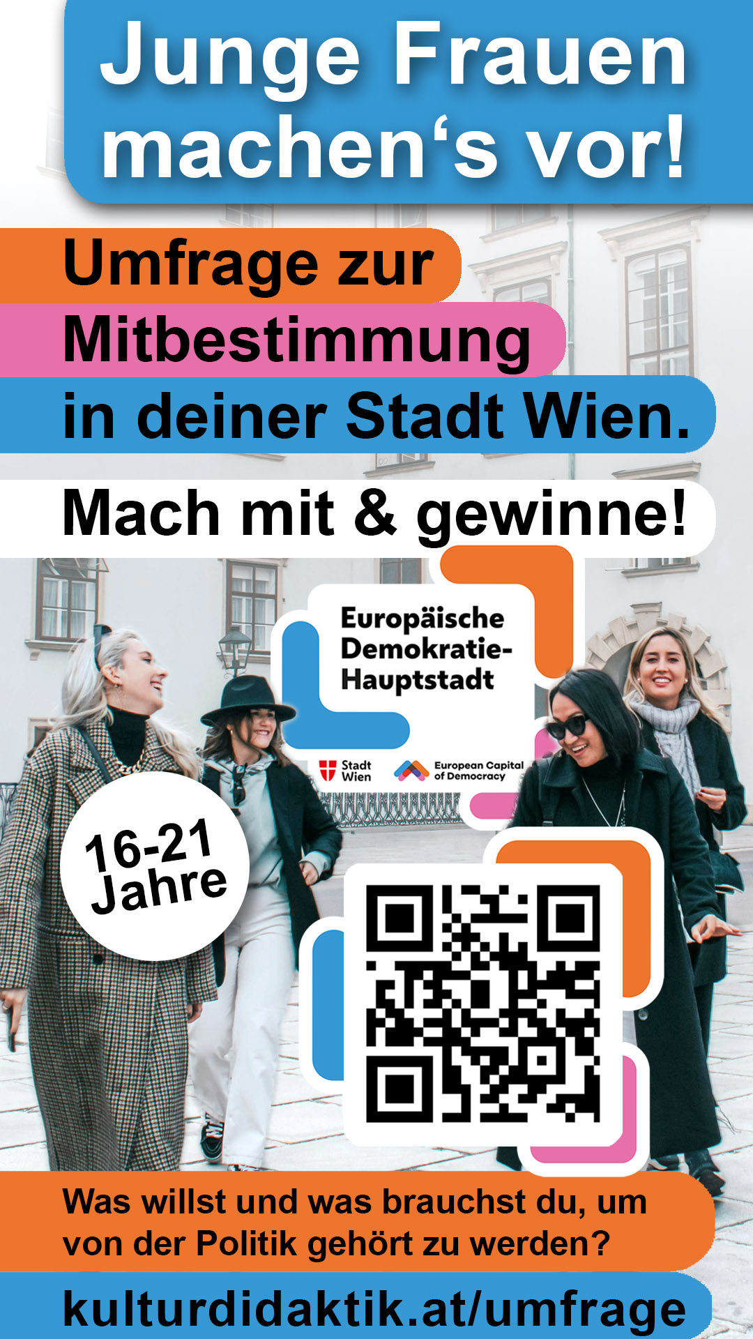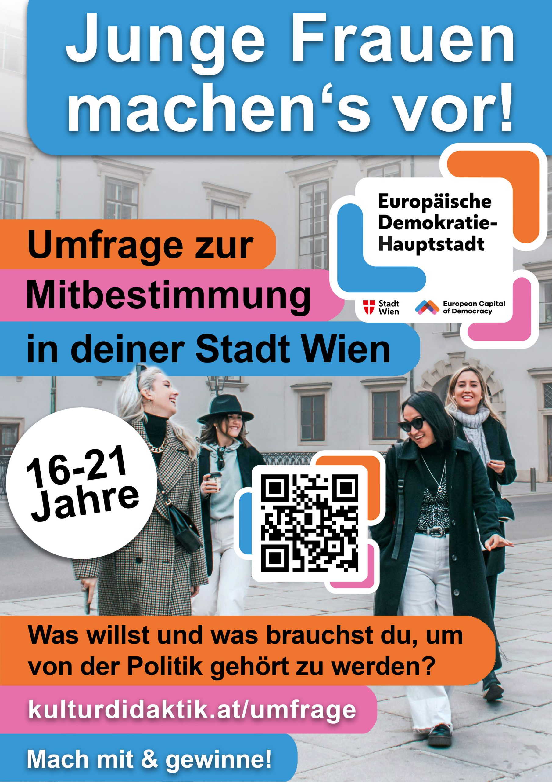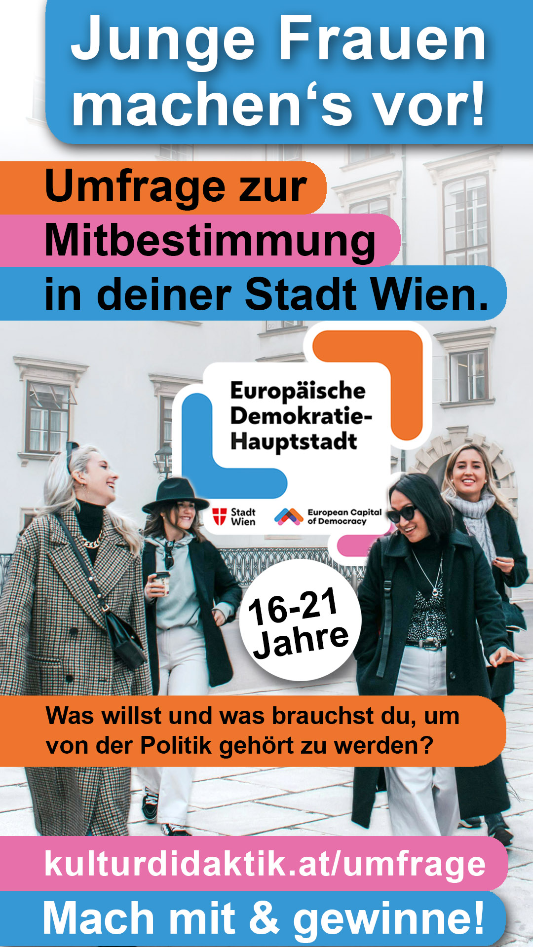 Was beschäftigt junge Frauen in Wien? Welche Ideen und Anregungen haben sie für ihre Stadt und ihren Bezirk? Im Rahmen eines Projekts zur Europäischen Demokratiehauptstadt Wien befragen wir dazu junge Wienerinnen zwischen 16 und 21 Jahren. Auch deine Meinung zählt!